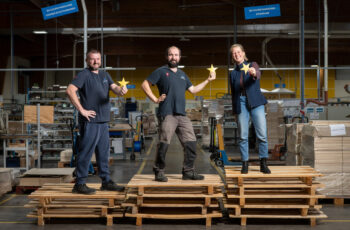 Ici ça refend, ça rabote, ça tronçonne, ça trie, ça contrôle… Ici, c’est la scierie ! C’est dans cet atelier que débute le chemin du bois chez Adam. Six coéquipiers et 3 machines y orchestrent, chaque jour, l’étape initiale de la transformation des près de 30 000 planches de bois brut stockées dans le hangar de l’entreprise. Visite en compagnie de Frédéric, chef d’atelier, et Tommy-Lee, membre de l’équipe.