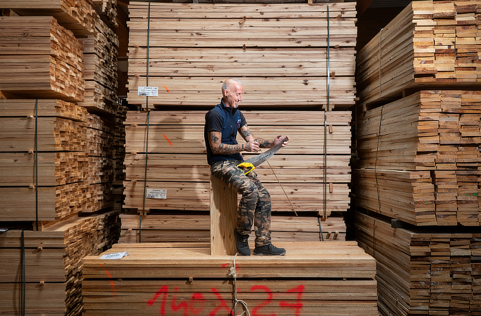 Une fois les pièces débitées par ses collègues, le « trieur » du jour entre en scène… Avec son œil aiguisé, d’un geste sûr et rapide, il les sépare en deux piles : les « jolis » ‒ ou sans et petits nœuds ‒ et les « vilains » ‒ ou rustiques avec plus de singularités*. À part, une 3e pile : « C’est la recoupe. Elle est mise de côté et sera réutilisée pour d’autres commandes. Notre objectif, c’est de jeter le moins possible », indique Frédéric. Les pièces empilées sont ensuite mises en palettes, direction, au choix : le rainage, l’usinage, le marquage… « C’est une certaine responsabilité, commente Frédéric. Si on se plante dès le début, c’est toute la chaîne qui en pâtit ». Un écueil évité la plupart du temps grâce aux procédures d’auto-contrôle, aux compétences et à l’expérience de l’équipe.